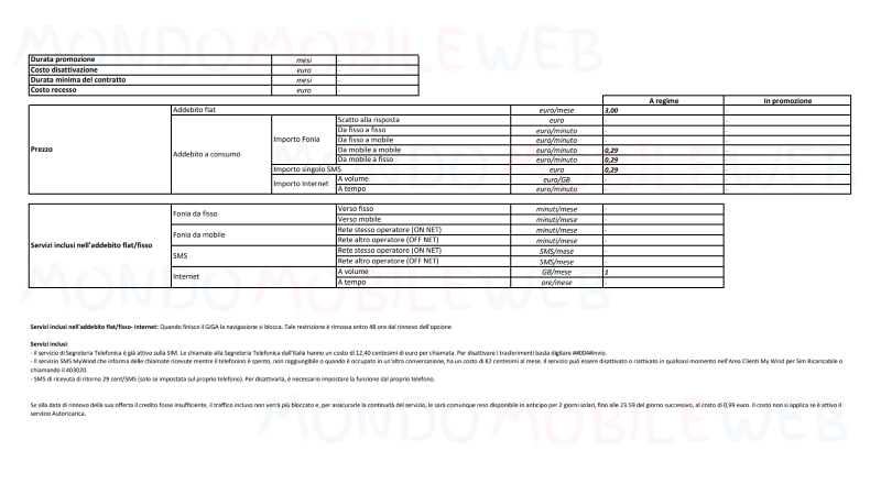 Una volta terminato il Giga incluso nel piano, la navigazione verrà bloccata, restrizione che sarà rimossa entro 48 ore dal rinnovo dell’opzione. Inoltre, saranno inclusi i servizi di Segreteria Telefonica, SMS MyWind e SMS di ricevuta di ritorno.