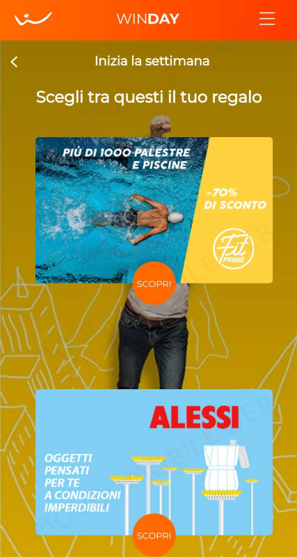 Per quanto riguarda i regali di oggi, Lunedì 16 Settembre 2019, Wind offrirà ad alcuni clienti la possibilità di scegliere fra due premi: sconto del 70% per l’acquisto di abbonamenti o singoli ingressi in piscine o palestre presenti su sito o app Fitprime, o in alternativa fino al 30% di sconto su alcuni prodotti Alessi selezionati presenti su un sito dedicato all’iniziativa.