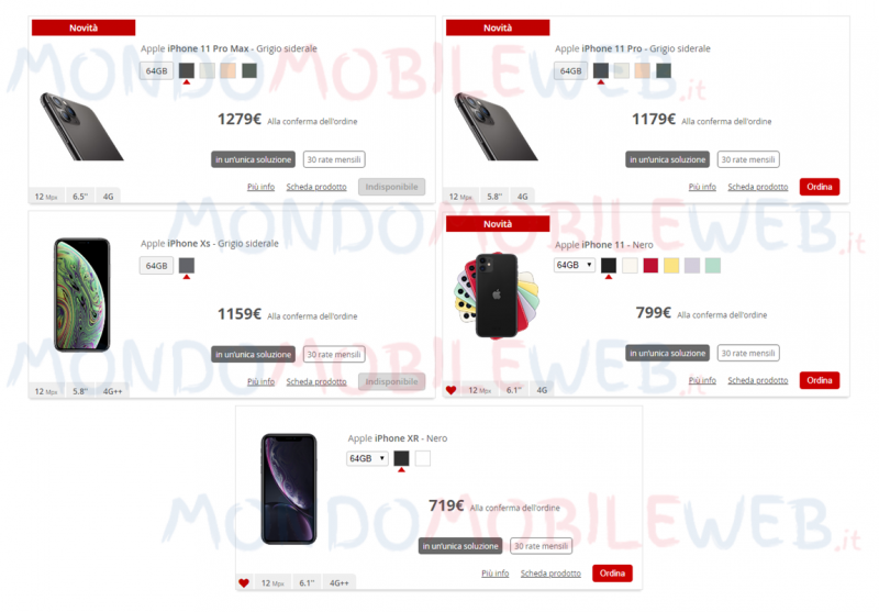 Risultano invece disponibili, allo stesso prezzo, anche i nuovi Apple iPhone 11 Pro 64GB nelle colorazioni Grigio Siderale e Verde Notte (indisponibile, al momento, nei colori Argento e Oro) e iPhone 11 da 64GB nelle colorazioni Nero, Bianco, Rosso e Giallo (indisponibile nei colori Viola e Verde) insieme alla variante da 128GB nella solo colorazione Nero.