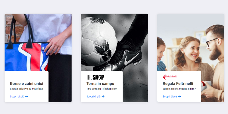 Infine, dal 1° Ottobre 2019, vi è anche un’apposita sezione chiamata Pensati per te, in cui vengono mostrati i vantaggi più affini alle preferenze e categorie di interessi del cliente, con offerte più vicine alla propria zona di residenza.