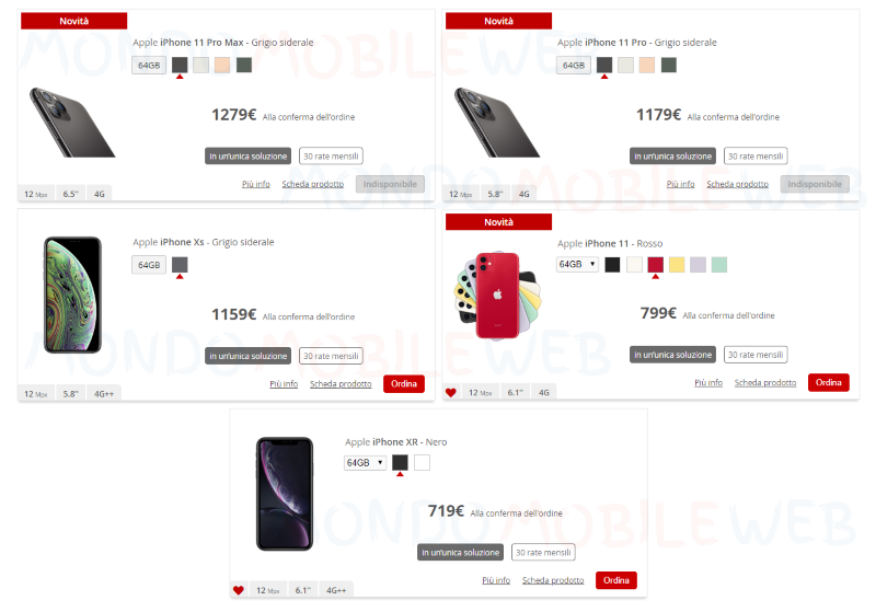 • iPhone 11 64GB: 30 rate mensili da 21 euro con un anticipo di 169 euro oppure 799 euro in un’unica soluzione.
