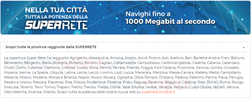 Di recente, infatti, come raccontato da MondoMobileWeb, sono state aggiunte nuove 45 province alla lista di quelle coperte da Super Rete 4.5G in alcune pagine del sito Wind (fra cui quella dell’offerta All Digital), per un totale di 104 province raggiunte, completando quasi del tutto la copertura nazionale.