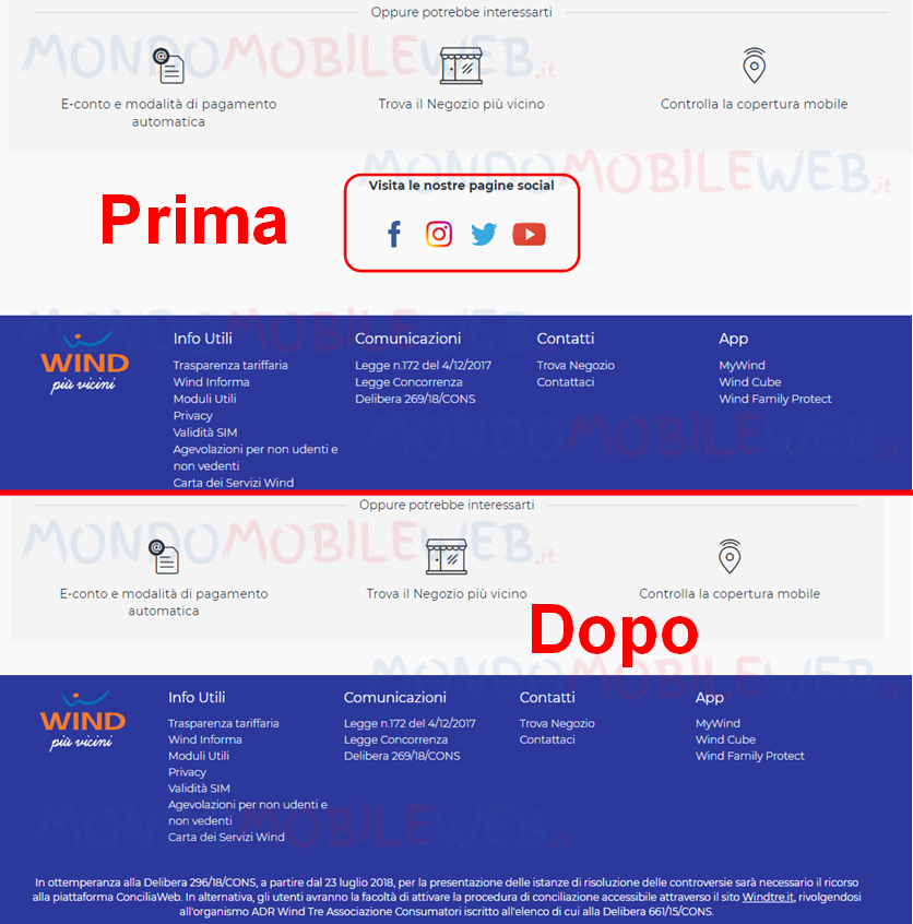 Infine, si segnala che sul sito ufficiale di Wind sono anche spariti i pulsanti con i link che riportavano alle pagine Facebook, Twitter, Instagram e YouTube dell’operatore. In precedenza si trovavano in fondo al sito, subito prima dei principali link utili.