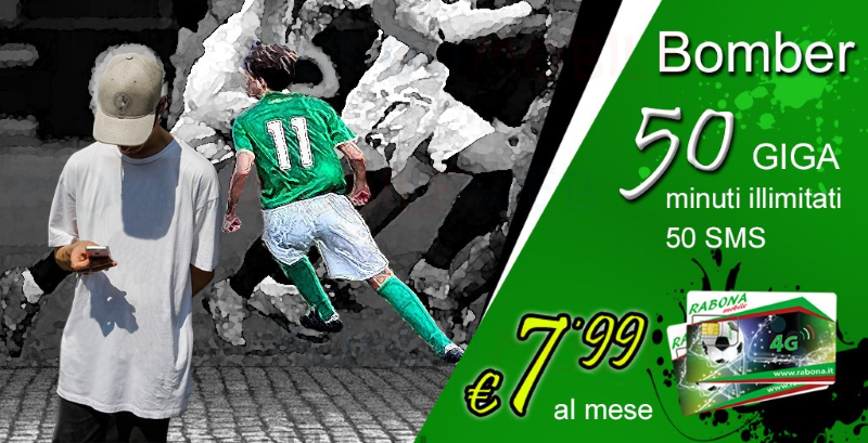 • Bomber: minuti illimitati verso tutti, 50 SMS verso tutti e 50 Giga di traffico dati in 4G a 7,99 euro al mese. È previsto un costo di attivazione di 2 euro. Disponibile fino al 28 Ottobre 2019, salvo cambiamenti;