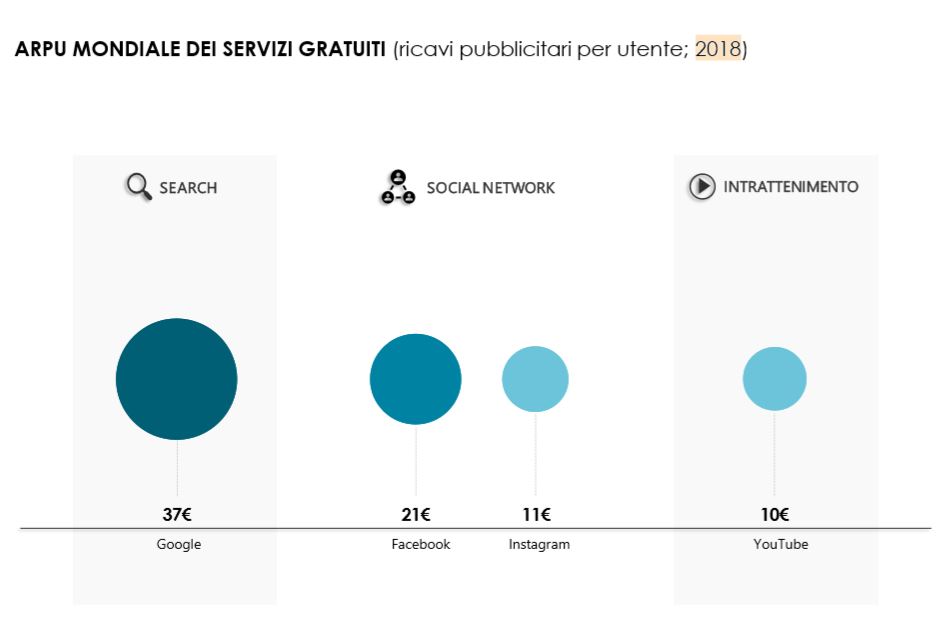 Il grafico sopra riportato segnala che, secondo le stime dell’AGCOM, Google guadagna circa 37 euro per singolo utente tramite le ricerche, mentre Facebook e Instagram con i social guadagnano in media rispettivamente 21 euro e 11 euro. Youtube, con i dati generati tramite l’intrattenimento, si ferma a quota 10 euro per utente.