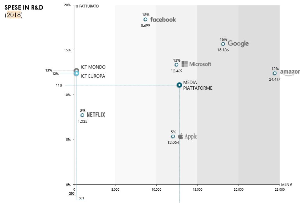 Il report pubblicato oggi si concentra sui valori del 2018 e mostra come in media le piattaforme online presentino una profittabilità lorda del 49% e un margine operativo pari al 21% dei ricavi, con spese ingenti in innovazione (13 miliardi in media nel 2018) e in asset patrimoniali (195 miliardi negli ultimi 3 anni).