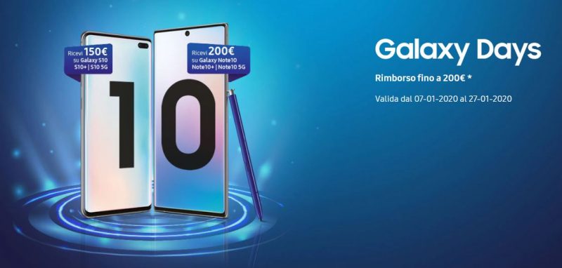 È partita ieri, 7 Gennaio 2020, la promozione di Samsung Italia denominata “Galaxy Days”, che permette a chi decide di acquistare uno smartphone (tra quelli coinvolti) in uno dei negozi riportati di seguito (store dei principali operatori telefonici inclusi), di ottenere un rimborso fino a 200 euro.