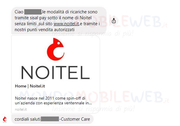 In più, al punto 3 “Unità di credito telefonico” delle Condizioni Generali del servizio Mobile, oltre a citare come esempio di modalità di ricarica della SIM anche il servizio PiùRicarica, Noitel afferma che differenti metodologie di pagamento potrebbero essere rese disponibili in qualunque momento.