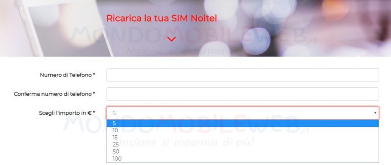 Ricarica online: effettuabile accedendo direttamente al sito ufficiale dell’operatore www.noitel.it. Nel dettaglio, si tratta della sezione “Ricarica la tua SIM Noitel“, dove oltre all’inserimento del numero di telefono sul quale effettuare la ricarica, viene anche richiesto di selezionare il taglio desiderato tra quelli disponibili (5, 10, 15, 25, 50 e 100 euro).