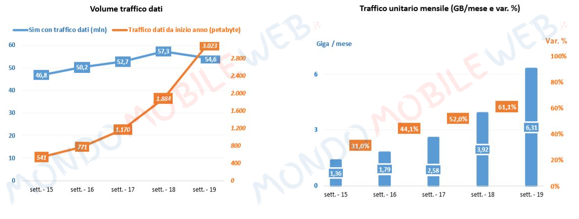 Passando adesso al traffico dati consumato, l’Autorità ricorda che da Settembre 2015 al 2019 le SIM che hanno svolto traffico dati sono passate dal 50% al 70% circa di quelle human complessive. Il traffico dati complessivo nel 2019 mostra inoltre un aumento del 60,4% rispetto ai primi nove mesi dell’anno precedente. Per quanto concerne invece i consumi medi unitari mensili, a Settembre 2019 si stima un valore di 6,31 Giga al mese, in crescita del 60% rispetto allo stesso periodo del 2018.