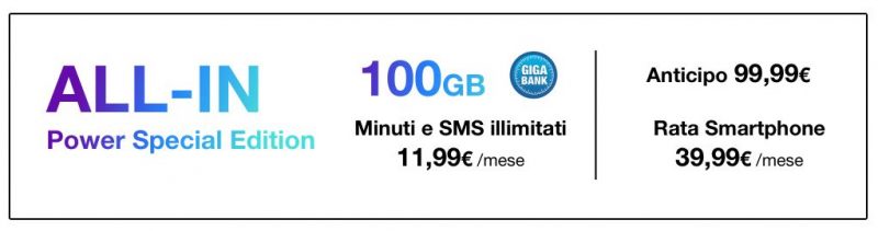 I nuovi clienti che desidereranno la All-in Power Special Edition con smartphone dovranno sostenere un costo di attivazione di 6,99 euro, invece di 55,99 euro con offerta attiva per 24 mesi. I restanti 49 euro, rateizzati in 24 rate mensili da 2,04 euro, non verranno addebitati con SIM attiva per tutta la durata contrattuale prevista. In caso di recesso anticipato saranno addebitate le rate mancanti.