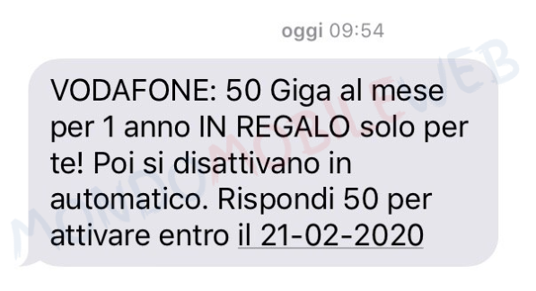 Ecco l’sms informativo nel caso in cui venga proposta tramite messaggio: “Gentile Cliente per te 50 Giga al mese gratis per un anno: puoi attivarli chiamando il 42100 entro il 02/08. Dopo 1 anno si disattivano in automatico e senza alcun costo“.