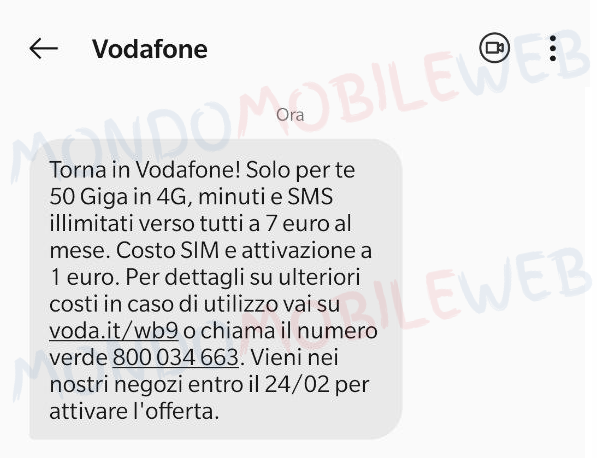 Ecco l’SMS inviato ad alcuni ex clienti: “Torna in Vodafone! Solo per te 50 Giga in 4G, minuti e SMS illimitati verso tutti a 7 euro al mese. Costo SIM e attivazione a 1 euro. Per dettagli su ulteriori costi in caso di utilizzo vai su voda.it/wb9 o chiama il numero verde 800034663. Vieni nei nostri negozi entro il 24/02 per attivare l’offerta”.