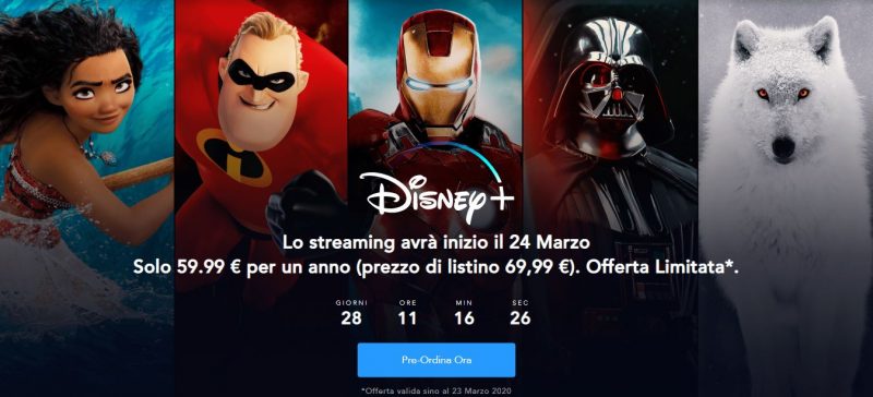 Come annunciato qualche tempo fa, Disney+ sbarcherà ufficialmente in Italia il 24 Marzo 2020 e per l’occasione ha deciso di mettere a disposizione di coloro che vorranno godere del suo servizio di intrattenimento, una particolare promo che consente di risparmiare 10 euro sul prezzo di listino annuale previsto (che a condizioni normali ammonterà a 69,99 euro).