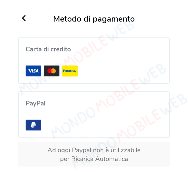 A tal proposito, per adesso PayPal non è utilizzabile come metodo di pagamento per attivare il servizio di Ricarica Automatica, come mostrato nella foto in basso.
