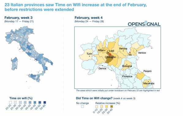 A Lodi, ad esempio, già nell’ultima settimana di febbraio vi era stato un incremento del 31,9% del tempo trascorso navigando in modalità WiFi tra gli utenti rispetto alle settimane precedenti, mentre a Piacenza il 36,9% in più.