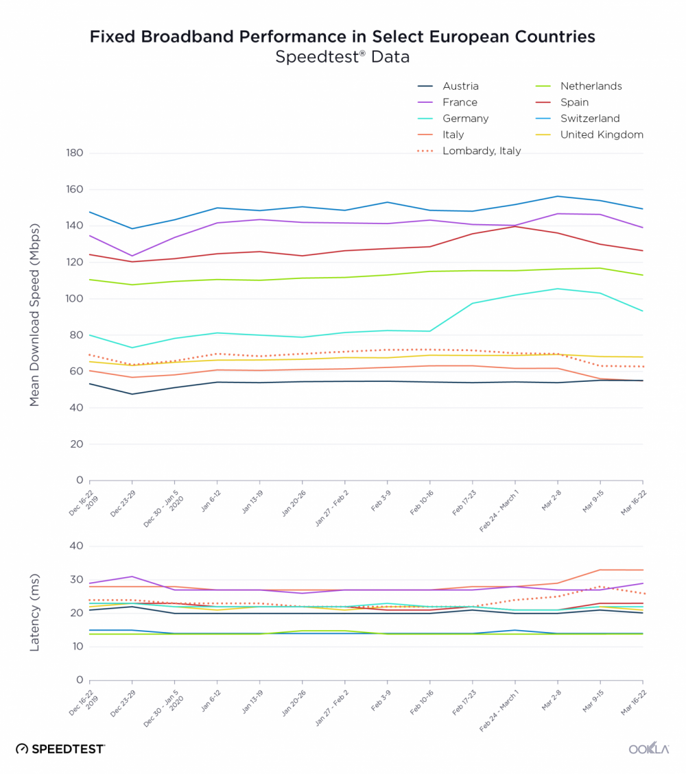 Alcuni Paesi europei hanno inoltre registrato un’impennata delle velocità sul fisso nel corso del mese, diversamente da quanto accaduto in Italia.