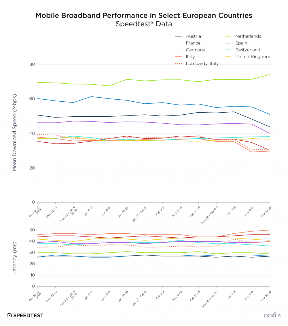 Il 19 Marzo 2020 venivano anche inseriti i dati di Austria, Olanda e Svizzera, non particolarmente colpite dalla crescita del traffico, e il 23 Marzo 2020, infine, è stata riscontrato un ulteriore calo delle performances di rete mobile nei principali Paesi europei, Italia inclusa.