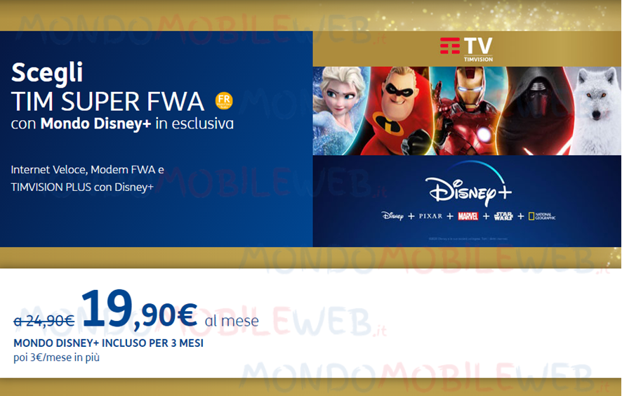 Dal 24 Marzo 2020 anche con TIM Super FWA è disponibile la promo lancio esclusiva per i clienti TIM sull’opzione Mondo Disney+, che permette di ottenere il nuovo servizio di streaming video della Disney in promozione gratuita per i primi 3 mesi, poi al costo promozionale di 3 euro al mese invece di 11,90 euro (servizio TIMVISION Plus incluso senza costi aggiuntivi), salvo disattivazione.
