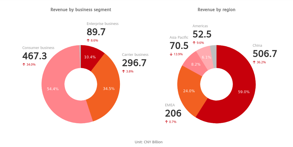 Come è possibile notare, il segmento principale resta quello del consumer business, con oltre la metà dei ricavi totali, in crescita del 34% anno su anno. Analizzando invece i ricavi per area, la Cina rappresenta ancora il 59% del totale, mentre l’area EMEA è rimasta stabile al 24% circa. Scendono i ricavi nell’area del Pacifico e incrementano invece in America, nonostante le pressioni internazionali dell’anno scorso.