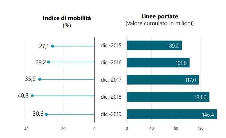 l’indice di mobilità, vale a dire il rapporto tra le linee mobilitate da inizio anno e la corrispondente customer base media complessiva, ammonta nel 2019 al 30,6%, un valore inferiore rispetto a quello dei precedenti due anni. Ciò suggerirebbe una maggiore stabilità della customer base, dopo l’elevata mobilità riscontrata invece nel 2018.