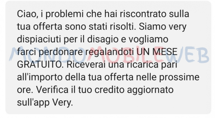 Il testo recita: “Ciao, i problemi che hai riscontrato sulla tua offerta sono stati risolti. Siamo very dispiaciuti per il disagio e vogliamo farci perdonare regalandoti UN MESE GRATUITO. Riceverai una ricarica pari all’importo della tua offerta nelle prossime ore. Verifica il tuo credito aggiornato sull’app Very”.