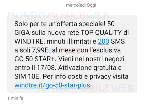 “Solo per te un’offerta speciale! 50 Giga sulla nuova rete TOP QUALITY di WINDTRE, minuti illimitati e 200 SMS a soli 7,99 euro al mese, con l’esclusiva GO 50 STAR+. Vieni nei nostri negozi entro il 17 Agosto 2020. Attivazione gratuita e SIM 10 euro. Per info costi e privacy visita windtre.it/go-50-star-plus.”