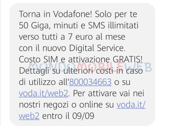 Torna in Vodafone! Solo per te 50 Giga, minuti e SMS illimitati verso tutti a 7 euro al mese con il nuovo Digital Service. Costo SIM e attivazione GRATIS! Dettagli su ulteriori costi in caso di utilizzo all’800034663 o su voda.it/web2. Per attivare vai nei nostri negozi o online su voda.it/web2 entro il 10/09.