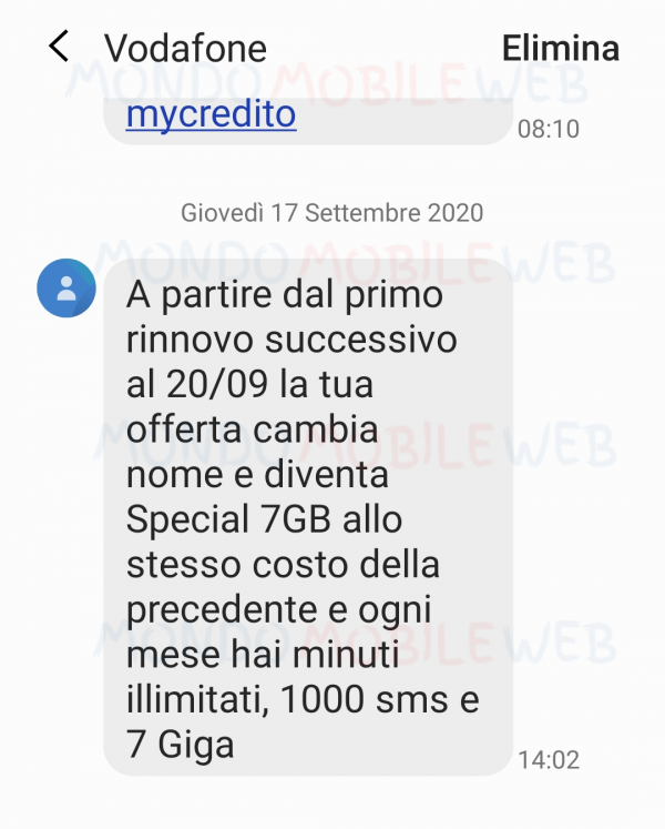 “A partire dal primo rinnovo successivo al 20 Settembre 2020, la tua offerta cambia nome e diventa Special 7GB allo stesso costo della precedente e ogni mese hai minuti illimitati, 1000 SMS e 7 Giga”.