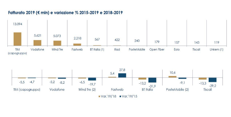 Come è possibile notare, alla fine del 2019 il leader in termini di fatturato era TIM con oltre 13 miliardi di euro, seguito da Vodafone e WindTre con rispettivamente 5,62 miliardi e 5,07 miliardi, e da Fastweb con 2,21 miliardi. Marginali invece i dati degli altri operatori, tra start-up e aziende di minori dimensioni.