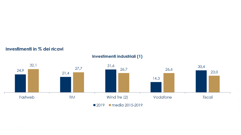 Di pari passo, anche gli investimenti dei principali gruppi italiani si sono contratti dopo l’asta delle frequenze 5G, con una riduzione del -5,2% nel 2019 rispetto all’anno precedente. Anche in questo contesto, Fastweb ha mostrato gli investimenti più elevati tra gli operatori. A livello cumulato, nel 2019 gli investimenti del settore rappresentano circa il 26,5% dei ricavi complessivi degli operatori italiani.