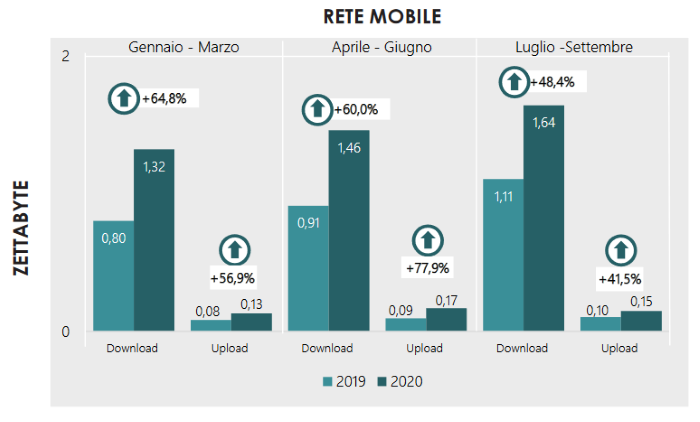 In upload, invece, l’incremento ha raggiunto il picco del +71,5% nel fisso rispetto al 2019 nel trimestre tra Aprile e Giugno 2020.