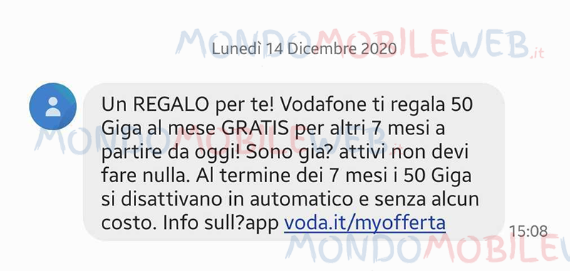 “Un regalo per te! Vodafone ti regala 50 Giga al mese GRATIS per altri 7 mesi a partire da oggi! Sono già attivi non devi fare nulla. Al termine dei 7 mesi i 50 Giga si disattivano in automatico e senza alcun costo. Info sull’app voda.it/myofferta.“