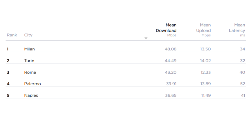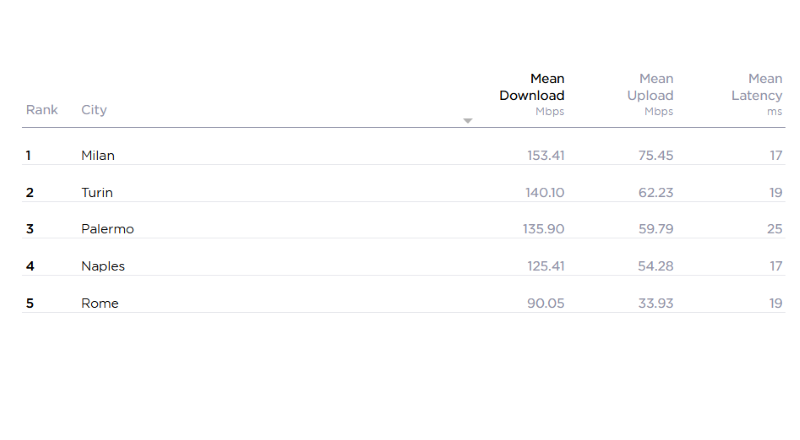Come è possibile notare, in questo caso i valori migliori restano quelli di Milano e Torino, mentre Roma, a differenza del segmento mobile, si trova in quinta posizione, dietro Palermo e Napoli.