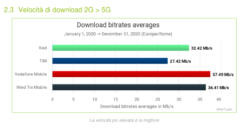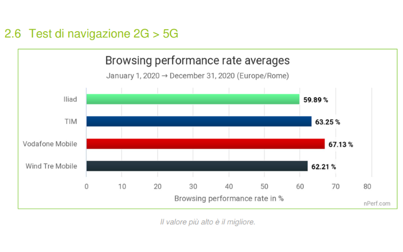 Durante il 2020 è stato Vodafone a fornire la migliore esperienza media di navigazione su rete mobile nel 2020, con una percentuale di successo nella navigazione pari al 67,13%, seguito da TIM al 63,25%, WINDTRE al 62,21% e infine Iliad al 59,89%.