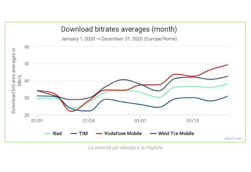 Il grafico sulla velocità media di download su base mensile mostra come gli operatori nel 2020 siano riusciti a garantire una velocità costante. Dopo un inizio dell’anno in caduta a causa del Covid che ha aumentato il traffico e la congestione sulla rete mobile, il rendimento degli operatori è aumentato nuovamente nella seconda metà dell’anno.