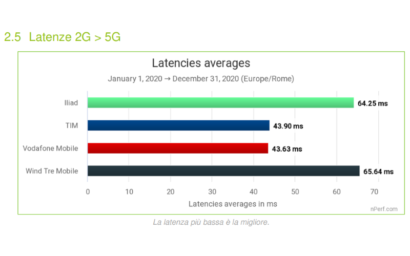 Dal punto di vista dei valori della latenza media, il Barometro di nPerf vede anche per il 2020 Vodafone e TIM ai primi posti, quasi a pari merito, rispettivamente con valori pari a 46,63 ms 43,90 ms. Segue poi WINDTRE con 65,64 ms e infine Iliad con 64,25 ms, con un risultato in miglioramento rispetto allo scorso anno.