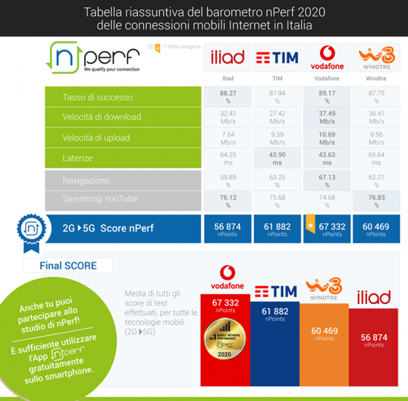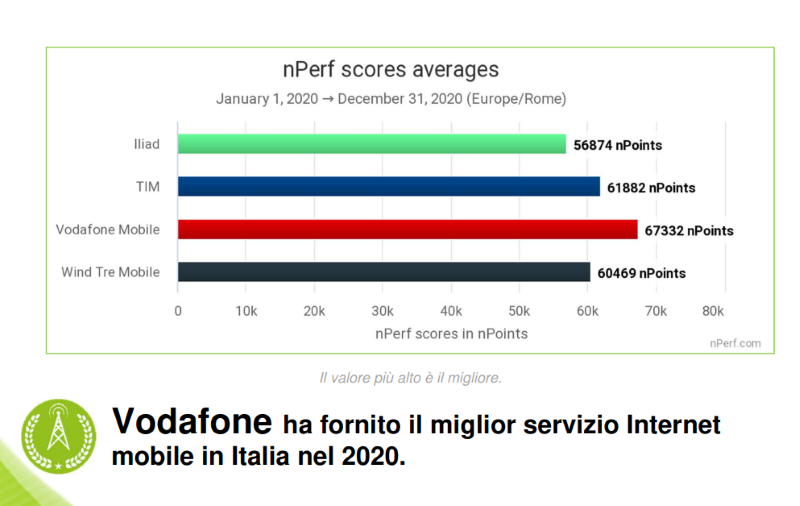 Secondo i test nPerf è dunque Vodafone ad aver fornito il miglior servizio su rete mobile in Italia nel 2020, facendo registrare 67.332 nPoints. Al secondo posto si piazza TIM con 61.882 nPoints, poi WINDTRE con 60.469 nPoints e infine Iliad con 56.874 nPoints.