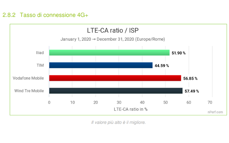 In questo caso, sono stati WINDTRE e Vodafone ad aver fornito il miglior tasso di connessione 4G+ nel 2020, raggiungendo rispettivamente il 57,49% e il 56,85%. Al terzo posto Iliad con il 51,90%, mentre chiude TIM con il 44,59%.