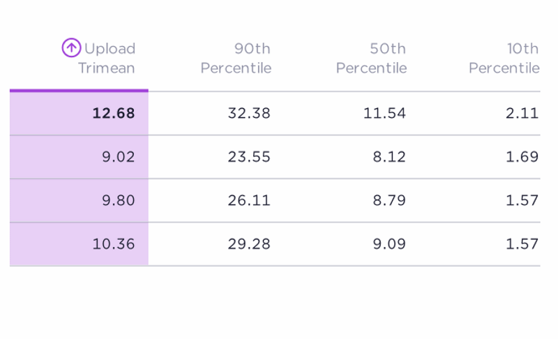 Nello specifico, però, il punteggio assegnato tiene conto di un calcolo dei percentili che dà maggiore peso alla tendenza centrale: in altri termini, Speedtest usa le velocità medie del decimo percentile, del cinquantesimo percentile (la cosiddetta mediana, ovvero il valore che si trova al centro della distribuzione) e del novantesimo percentile, combinandole con un rapporto di media ponderata 1:8:1 rispettivamente e dunque dando maggiore enfasi alla velocità del cinquantesimo percentile, quella mediana.