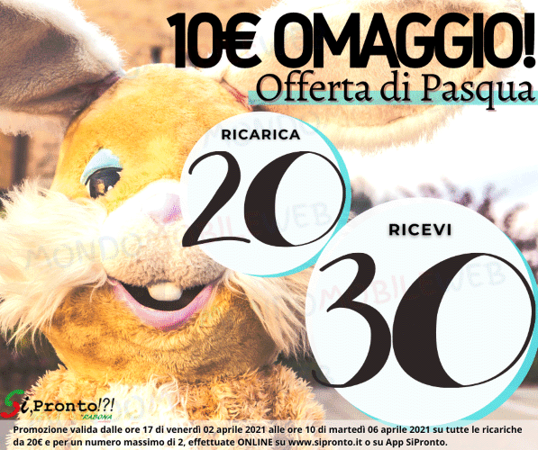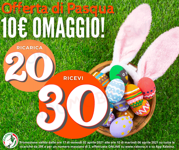 Nello specifico, l’offerta di Pasqua relativa alla ricarica prevede che per tutti i già clienti Rabona Mobile e Si, Pronto !?! che ricaricano online esclusivamente attraverso i siti ufficiali e l’App di Rabona e del suo brand secondario Sì, Pronto!?! un bonus di 10 euro, solo se il taglio scelto è quello di 20 euro.