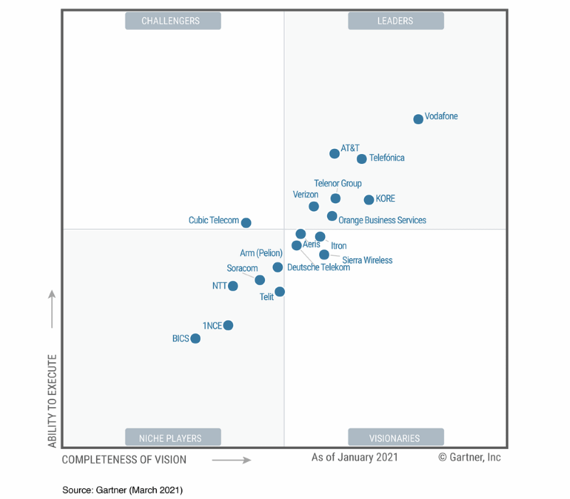 Come è possibile notare, il Magic Quadrant for Managed IoT Connectivity Services Worldwide vede in Vodafone l’attore principale in termini sia di completezza di visione che di capacità di esecuzione, seguito da Telefónica e AT&T, a cui fanno poi seguito Telenor Group, Kore, Verizon e Orange Business Services.
