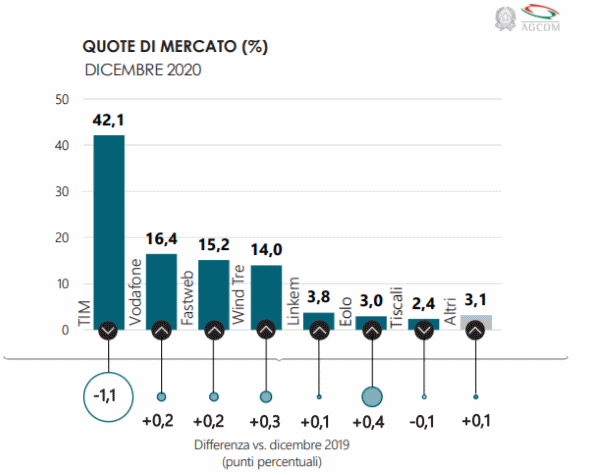 Anche in questo segmento broadband e ultrabroadband, la quota di mercato di TIM si mostra in contrazione (-1,1%) al 42,1%, mentre altri operatori presentano rialzi tra il +0,1% e il +0,4%.