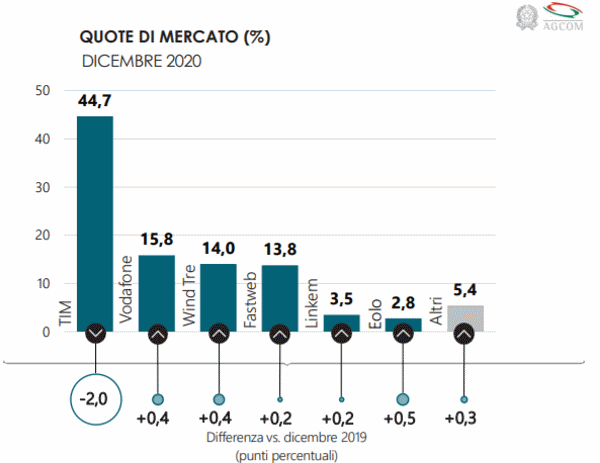 Come fatto anche per il segmento mobile, l’AGCOM evidenzia le quote di mercato nel segmento fisso, che mostrano il market leader TIM in calo del -2% intorno al 44,7%, seguito da Vodafone con il 15,8%, WindTre con il 14% e Fastweb con il 13,8%.