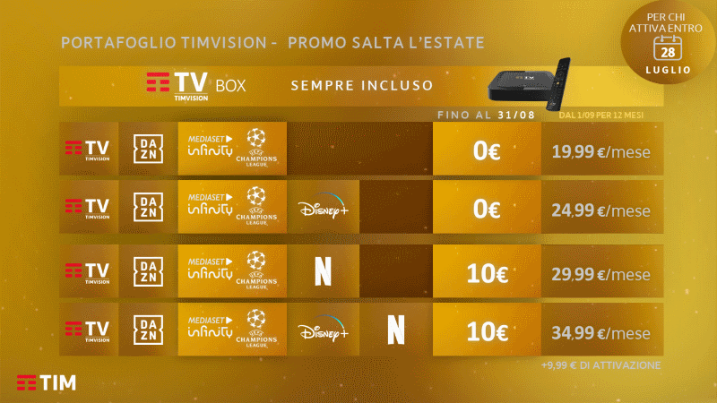 Infine, il pacchetto chiamato TIMVISION Gold, che comprende TIMVISION con DAZN, Disney+, Netflix e Infinity+, è proposto da TIM con costo di 10 euro al mese fino al 31 Agosto 2021, dal 1° Settembre 2021 a 34,99 euro al mese per 12 mesi, e successivamente a 49,99 euro al mese.