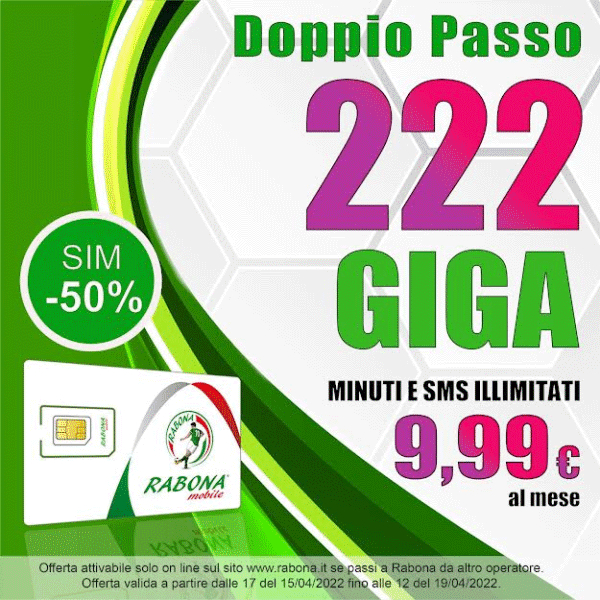 Rabona Doppio Passo include ogni mese minuti illimitati verso tutti i numeri di rete fissa e rete mobile nazionali, SMS illimitati verso tutti i numeri nazionali e 220 Giga di traffico internet mobile fino in 4G, il tutto al prezzo di 9,99 euro al mese.