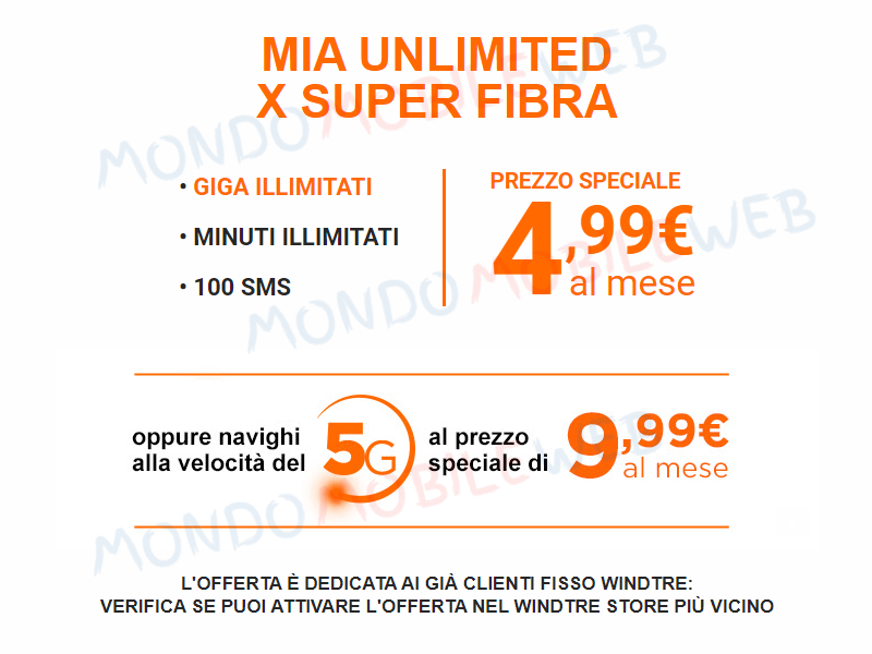 Come già accennato, nonostante la disponibilità della nuova versione 5G, ai già clienti di rete fissa selezionati viene comunque proposta principalmente l’offerta mobile WINDTRE MIA Unlimited x Super Fibra, con possibilità di ottenere prezzi mensili differenziati.