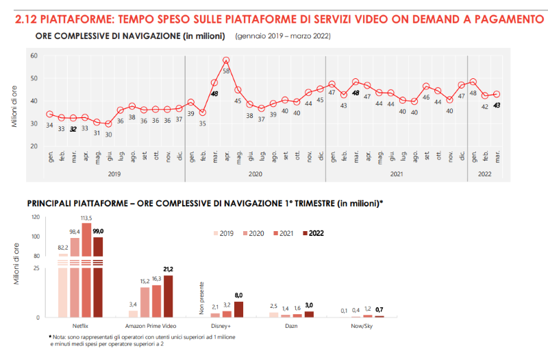 Secondo l’AGCOM è opportuno evidenziare anche che nei primi tre mesi del 2022 l’andamento del tempo di navigazione sui principali siti di streaming video a pagamento sia stato mediamente pari a circa 44,6 milioni di ore mensili, in flessione rispetto ai 46,2 milioni dei primi tre mesi del 2021.