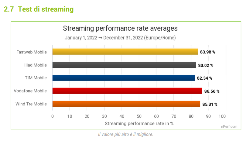 Nel test di streaming in 5G è stata TIM a fornire nel 2022 la migliore prestazione di streaming video in 5G, con una percentuale di performance media nello streaming video pari al 93,12%. Al secondo posto si è piazzata Vodafone con il 92%, poi Iliad con l’89,37%, poi WINDTRE con l’87,90% e infine Fastweb con l’86,28%.