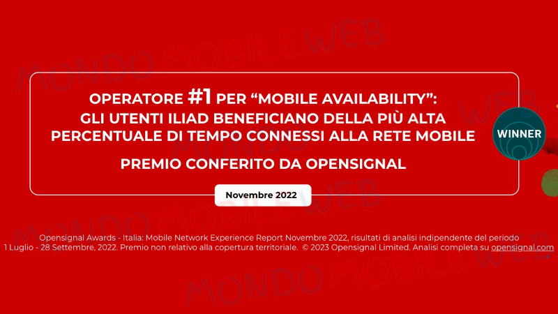 A partire da Dicembre 2022 Iliad Italia pubblicizzava il riconoscimento ottenuto nel Mobile Network Experience Report di Opensignal, lo studio che analizza l’esperienza sulle reti mobili dei principali operatori italiani, pubblicato a fine Novembre 2022 e riguardante i dati raccolti dall’app Opensignal dal 1° Luglio al 28 Settembre 2022, quindi nel corso del terzo trimestre del 2022.